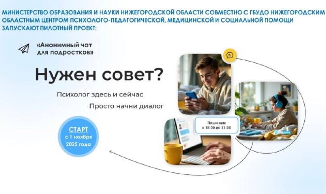 «Анонимный чат для подростков «Мы с тобой онлайн»Ссылка на платформу: https://мыстобойонлайн.рф/1 ноября 2025 года министерство образования и науки Нижегородской области совместно с Нижегородским областным центром психолого-педагогической, медицинской и социальной помощи запустили проект «Анонимный чат для подростков «Мы с тобой онлайн».Кто может написать в чат?Чат предназначен для детей и подростков в возрасте от 6 до 18 лет, обучающихся в школах или учреждениях СПО Нижегородской области. Каждый ребенок может анонимно написать в чат и получить поддержку!Что предлагает чат?• Возможность анонимно поделиться своими переживаниями со специалистами. О них никтоне расскажет.• Советы по улучшению эмоционального состояния от профессиональных психологов-консультантов. Они смогут помочь тебе.• Помощь в выборе правильного направления действий для преодоления трудных ситуаций.Любая проблема разрешима, поверь.Не оставайся наедине со своими переживаниями! Мы здесь, чтобы поддержать тебя.